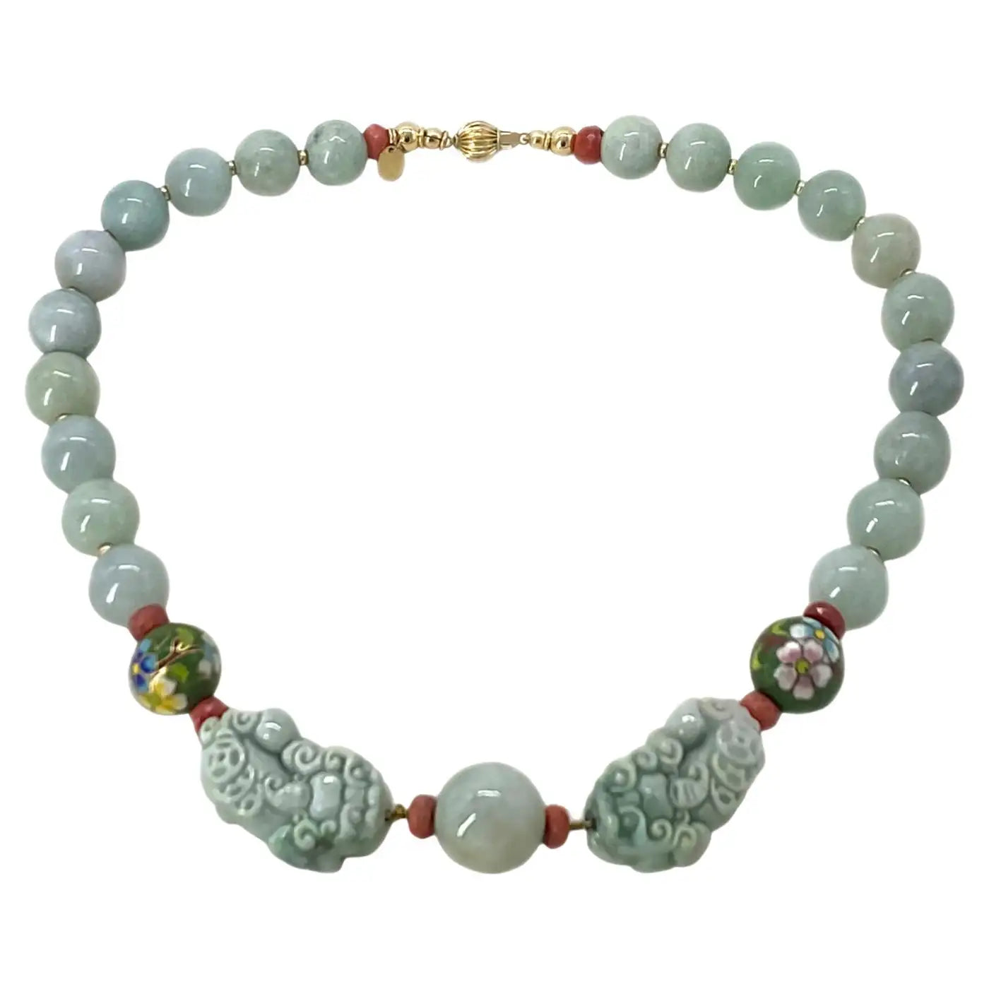 This is a grade A jadeite necklace with natural coral as spacers and gold filled components. We created this necklace with up to 14 mm smooth jade beads and wired a pair of carved jade Pixiu pendants and a 17 mm smooth jade bead in the center. It is touched up with two 15 mm cloisonné beads.
