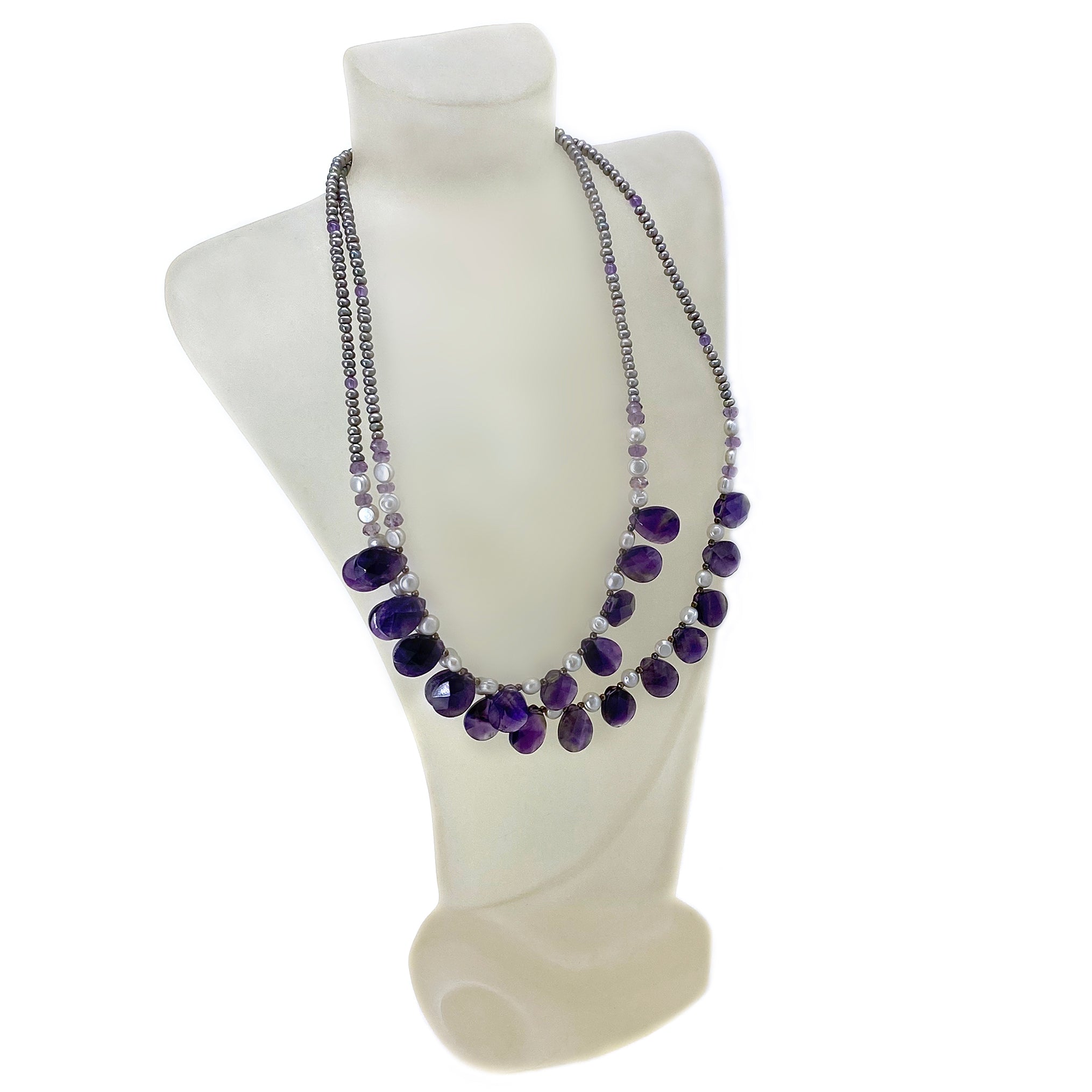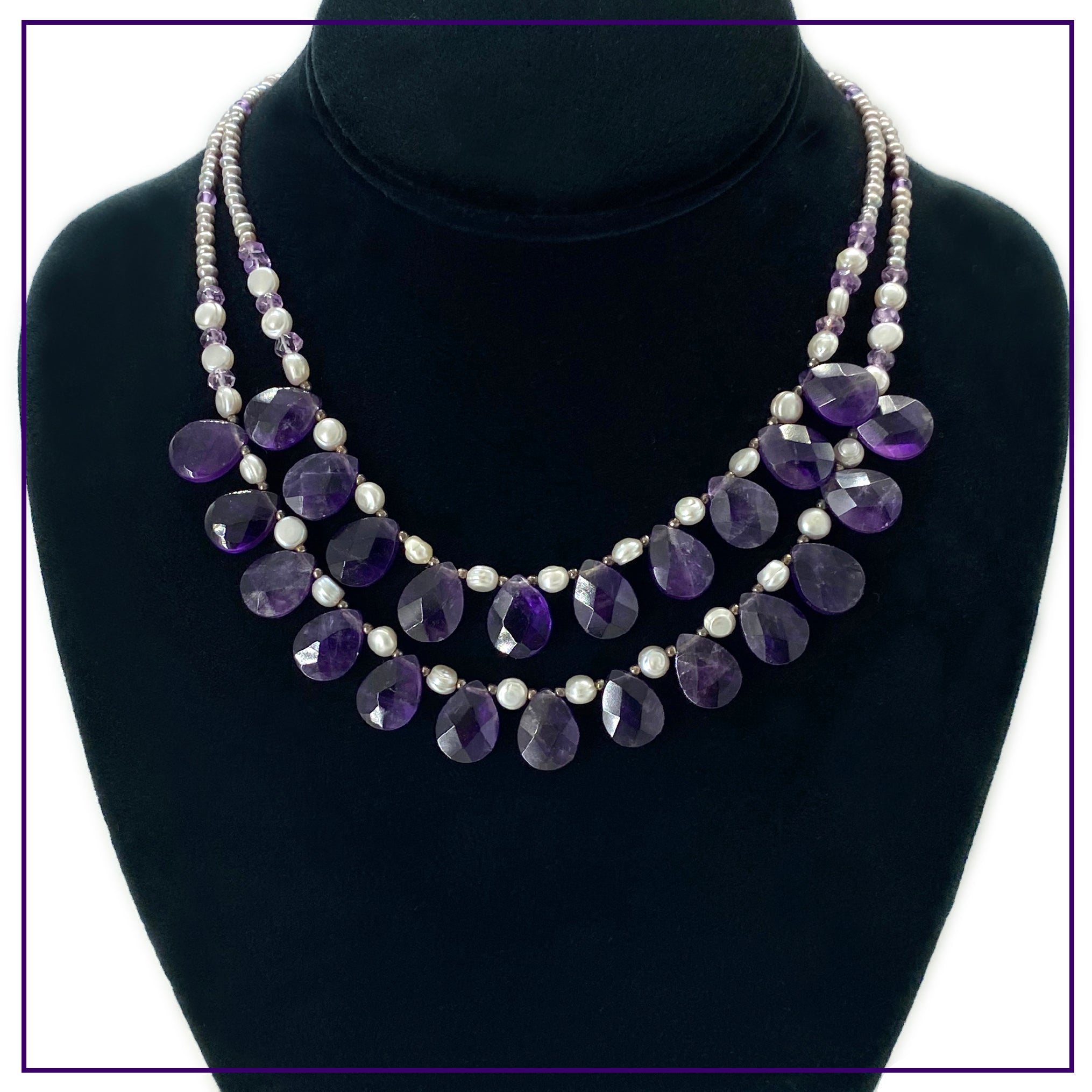 This is a double strand necklace we created with 11-14 mm faceted deep purple amethyst pear beads, 3 mm silver tone freshwater cultured pearls, plus a sterling box clasp with amethyst cabochon.