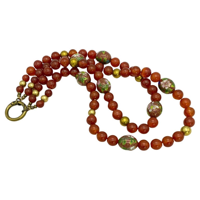 This is a Carnelian and Cloisonne double strand necklace. We created it with up to 11 mm smooth natural gemstone Carnelian beads and 10 mm brass beads. It is highlights with seven 18 x 15 mm egg shaped Cloisonne beads. Finally, with a 0.88 diameter brass ring clasp.