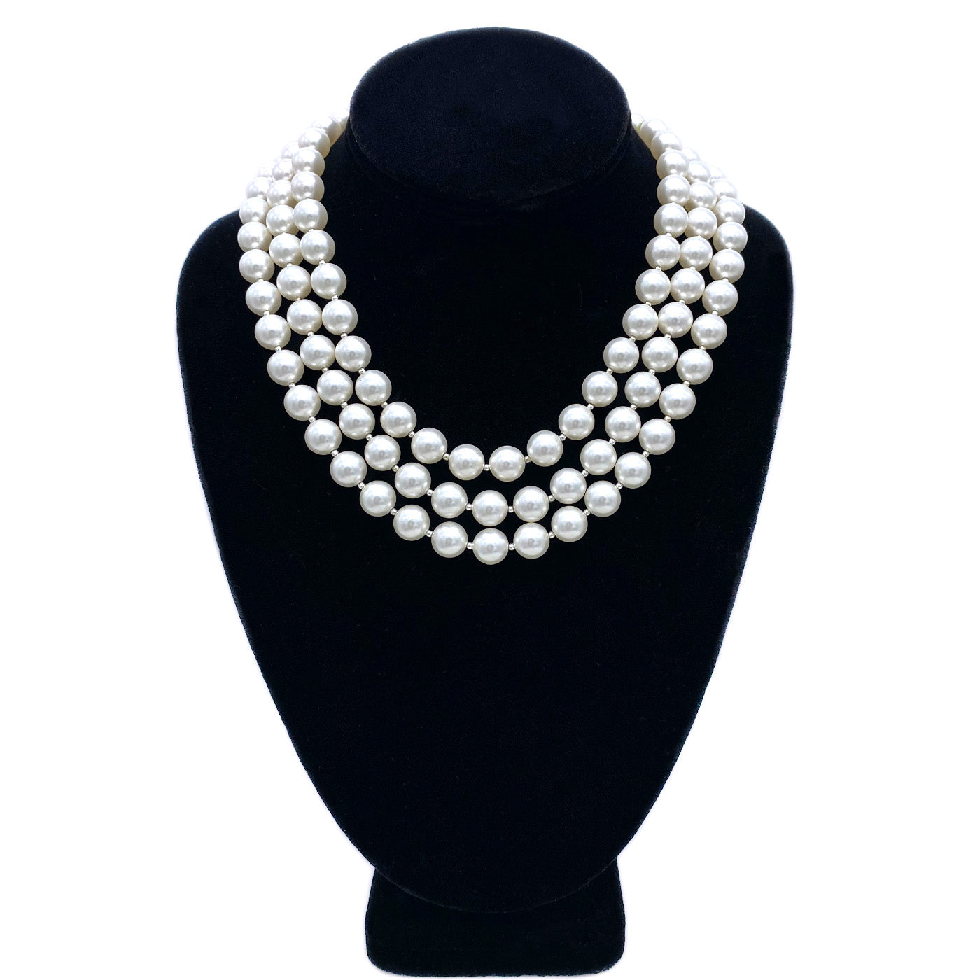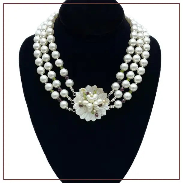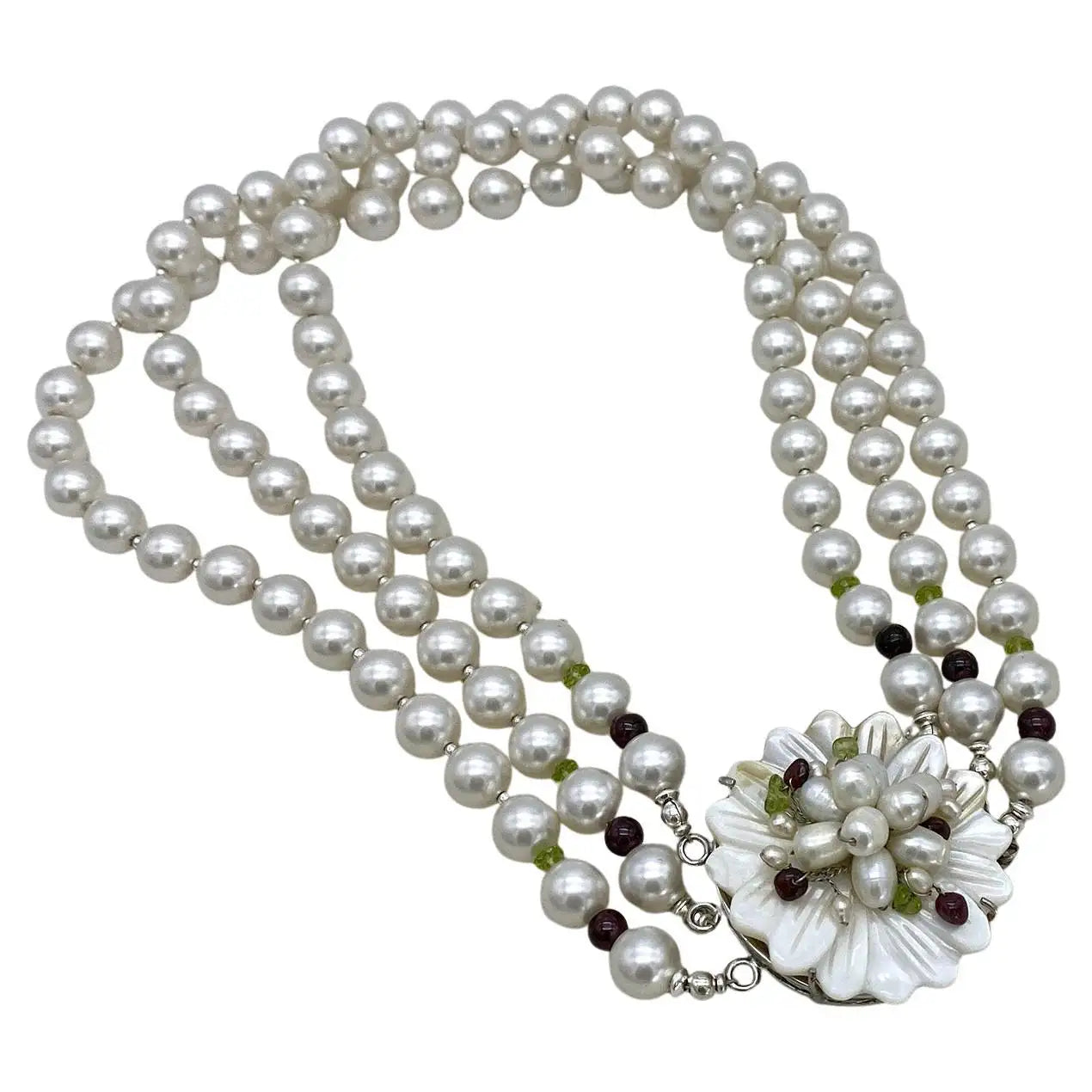 This is a Swarovski pearl triple-strand necklace. We created it with 10 mm Swarovski white faux pearls, garnets, faceted peridot and sterling silver components. There is a large (1.75" diameter) mother of pearl flower wired on to a silver tone box vintage clasp also decorated with garnet and peridot beads.