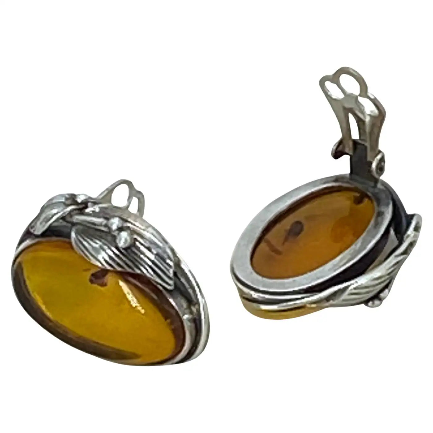 This is a pair of vintage Baltic Amber sterling silver clip-on earrings. Each earring has an oval shaped polished amber piece set in a sterling silver frame with a flower and leaf decoration on one side. There is an .925 stamp on the back of the clips.